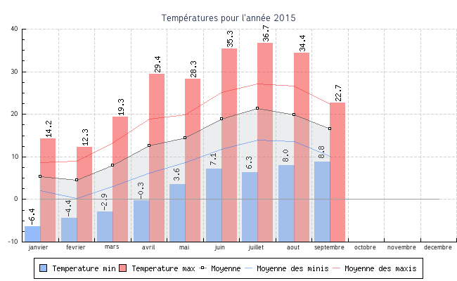 | juillet | 6.3 °C | 14.0 °C | 36.7 °C | 27.2 °C | 21.4 °C | 23.6 km/h | 173.9 km/h | OSO |