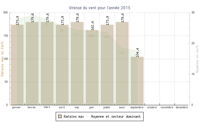 | septembre | 8.8 °C | 10.1 °C | 22.7 °C | 22.3 °C | 16.6 °C | 17.6 km/h | 104.4 km/h | NO |
